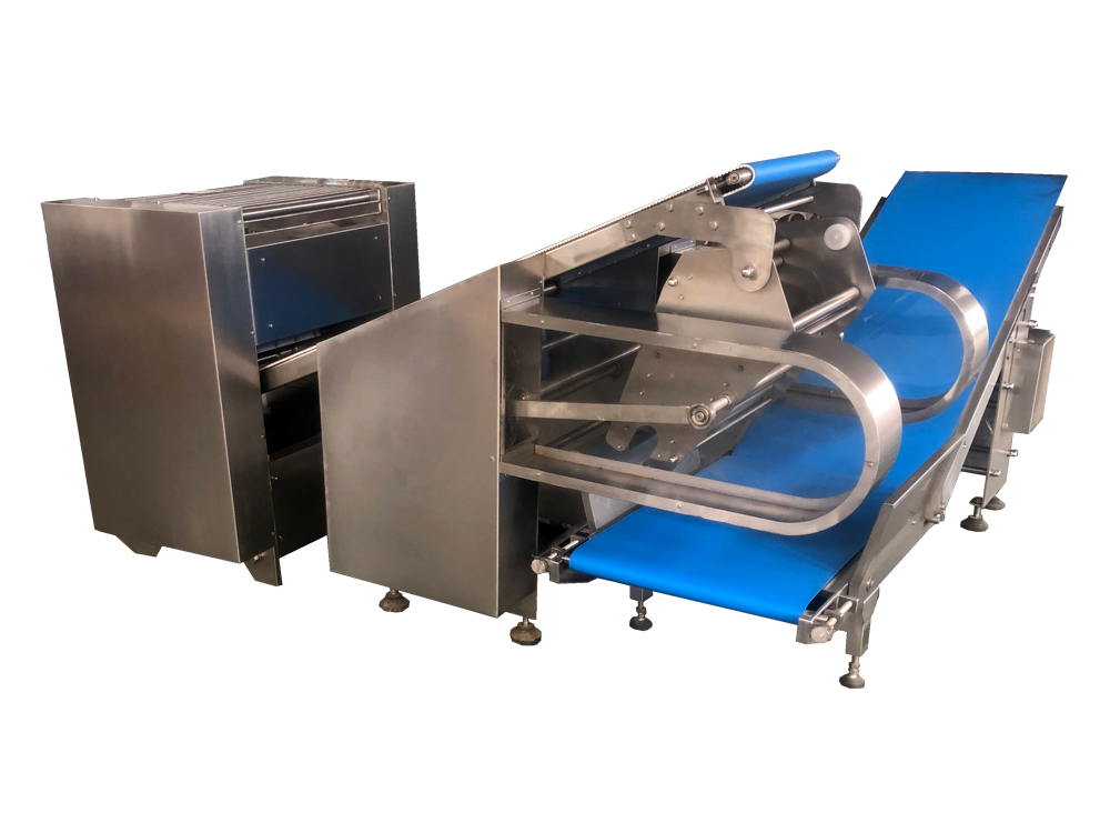2、疊層機使面帶Z字型折疊,進一步豐富面帶網(wǎng)狀結(jié)構,提高面筋度,設備可根據(jù)客戶場地需求選擇不同的擺放形式。